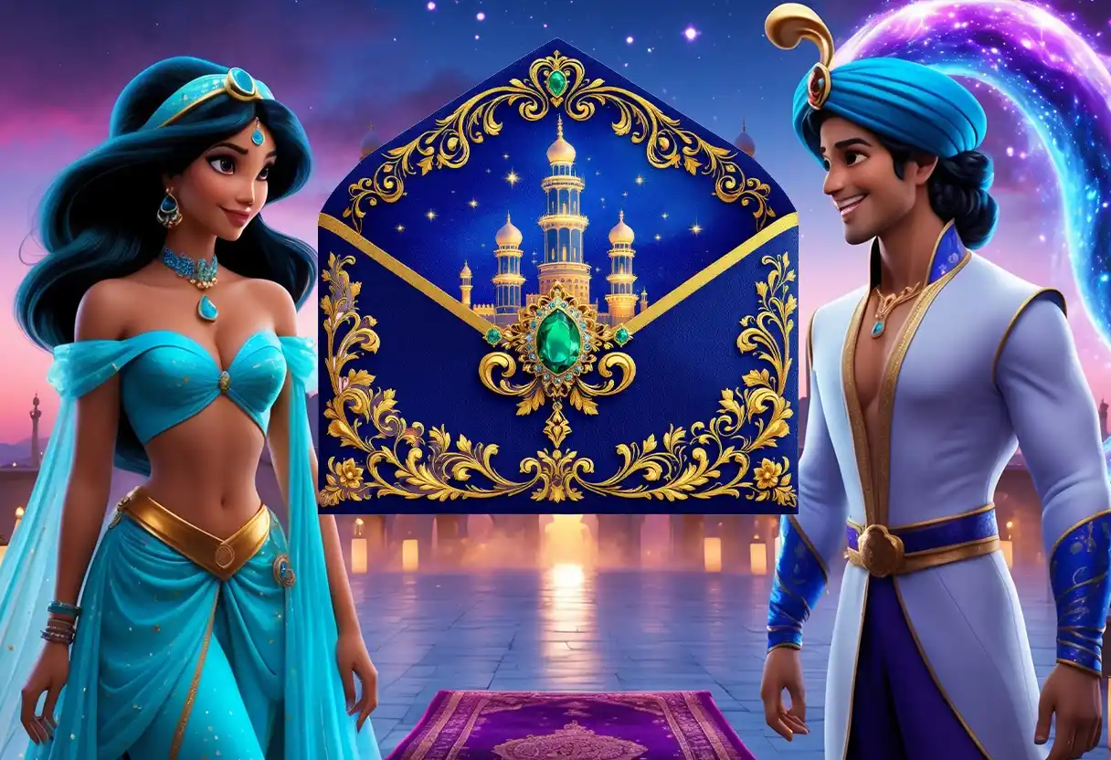 Nuestra invitación digital de Aladdin te transporta a un mundo lleno de alfombras voladoras, palacios y estrellas doradas. Con colores intensos y elementos inspirados en Agrabah, esta invitación es perfecta para cumpleaños temáticos o eventos especiales.