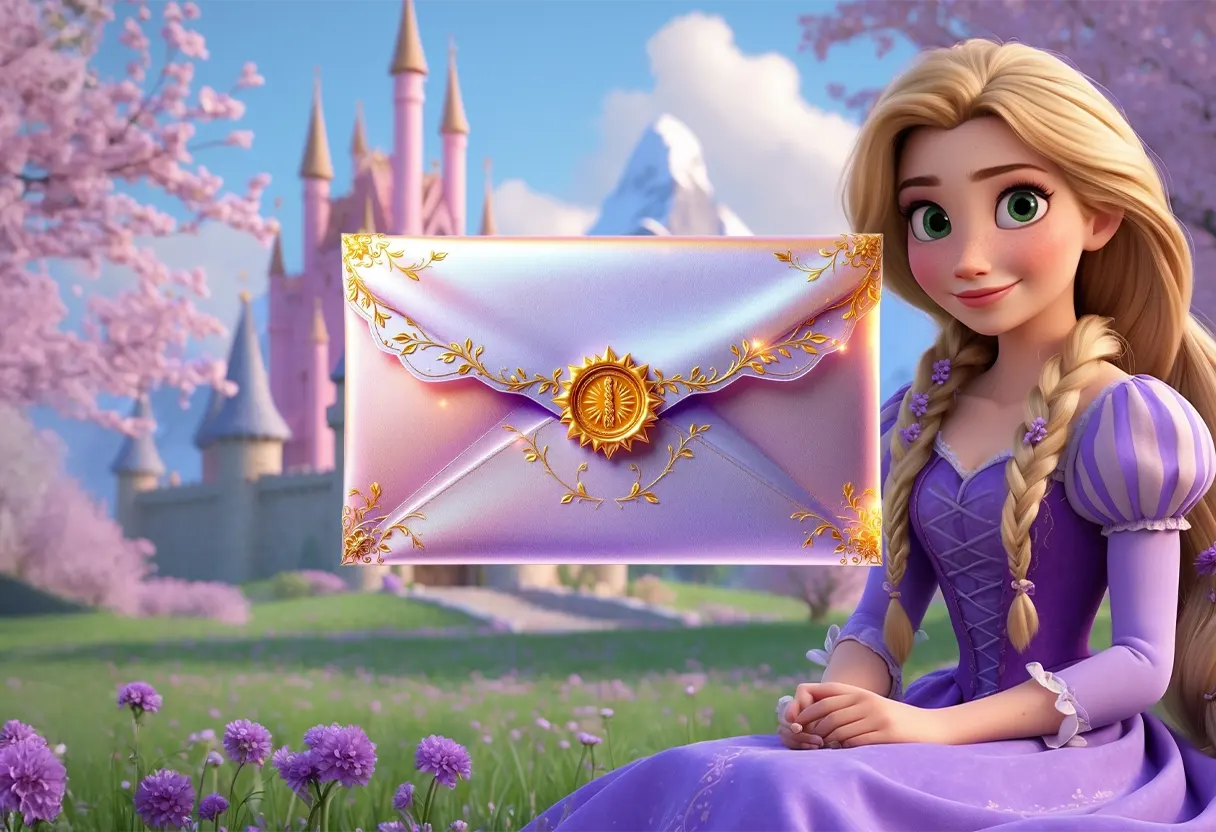 La invitación digital de Rapunzel ilumina tu evento con tonos lilas y dorados, faroles flotantes y detalles que evocan la libertad y diversión de la historia.